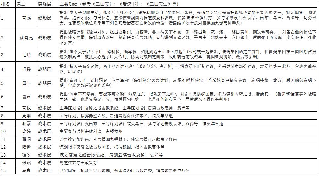 战略层谋士排名(按照各自阵营功绩和结局,从战略层到战术层排列)如下图: