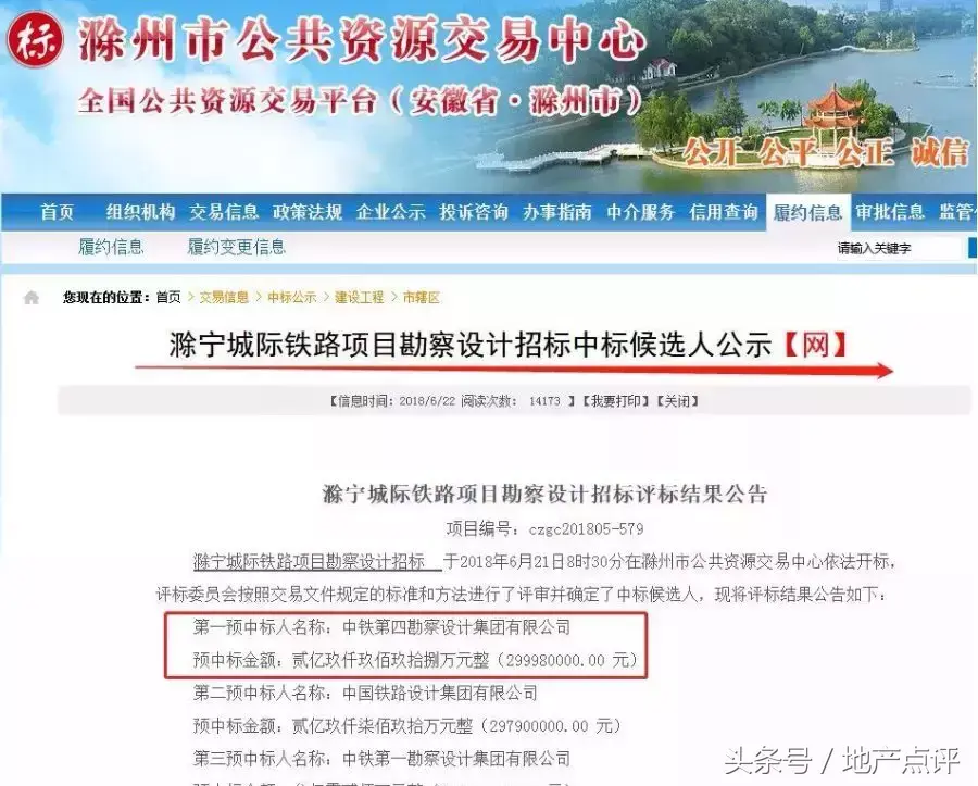 官方公布:滁宁城际铁路项目勘察设计招标成功,第一预中标候选人为中铁四局,预中标金额299980000元。