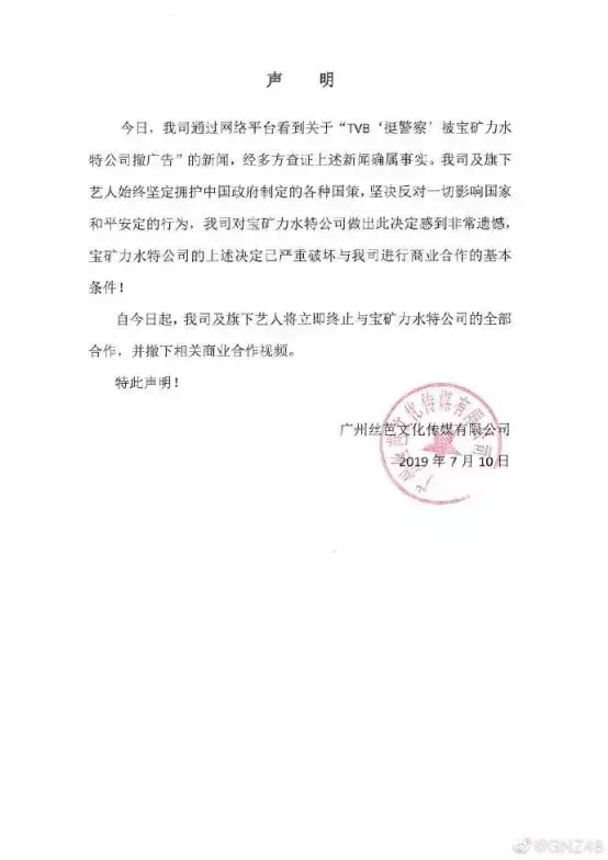 该女子团体所属公司在声明中表示,对宝矿力水特做出此决定感到非常遗憾,并决定自今日起,公司及旗下艺人将立即终止与宝矿力水特的全部合作,并撤下相关商业合作视频。