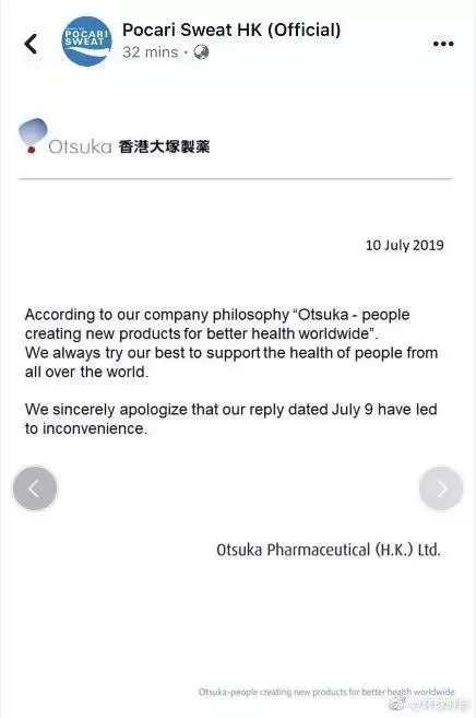昨天深夜,宝矿力水特香港分公司道歉了!