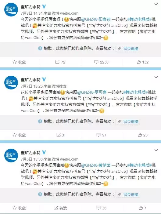 随后,记者浏览宝矿力水特官方微博@宝矿力水特的网页发现,分别于6日、7日和8日三天发布的、GNZ48成员参与的相关活动视频确已删除。