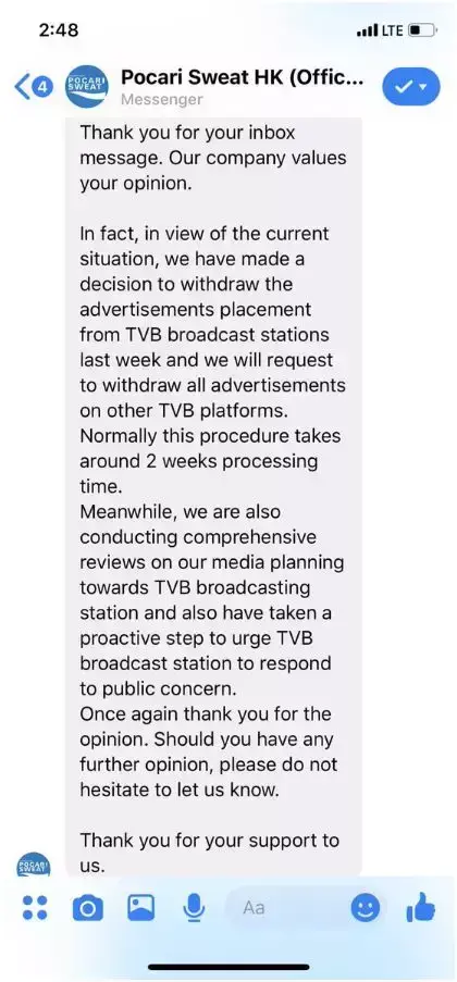 谢谢您的留言,本公司很重视您的意见。事实上,鉴于当前形势,我们上周已经做出了从TVB撤回广告的决定。一般情况下,这一流程需要两周左右时间。与此同时,我们也对我们面向TVB的媒体广告投放计划进行了全面审视,并敦促TVB回应公众关切。再次对您的意见表示感谢。如果未来还有进一步的意见表达,请勿犹豫,欢迎随时让我们知晓。谢谢您对我们的支持。