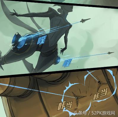 第二个就是这个“飞檐走壁”的技能了,从大腿上的某个神秘装置中发射两跳类似抓钩的东西,固定在某一处,可以将自己快速拉到抓钩的位置。具体在游戏中的表现应该是抓地形将自己拉过去,不过讲道理的话应该也能钩英雄或者是敌方小兵,多少也应该有点伤害吧!