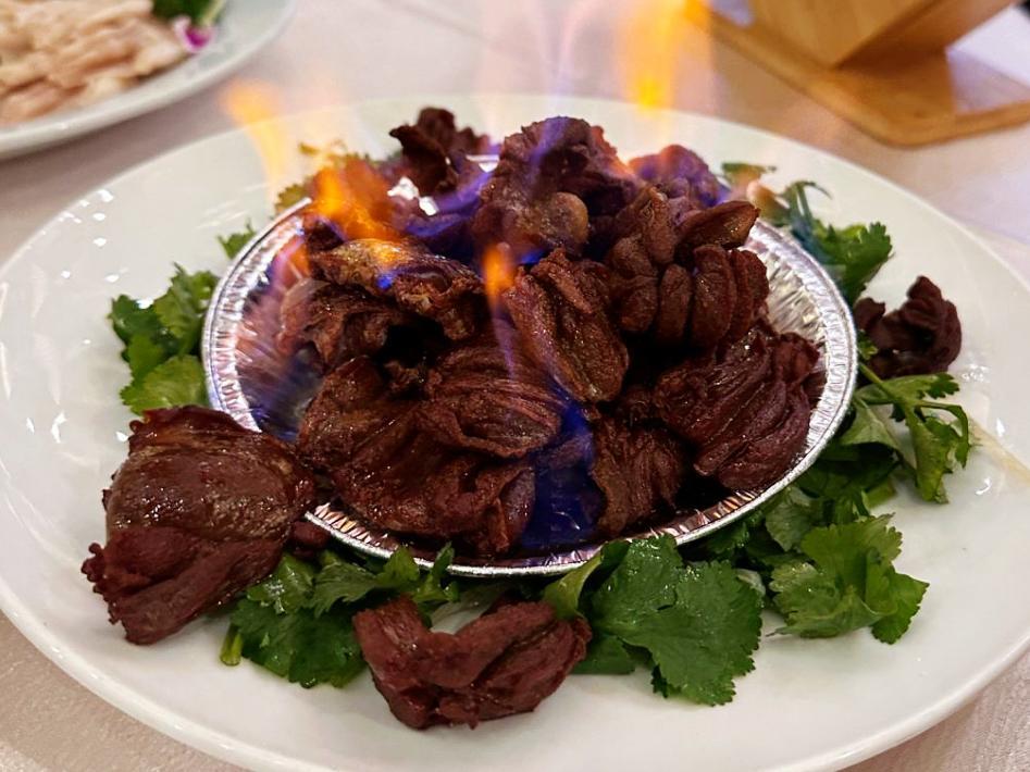 火燎鸭心,一个个小巧玲珑,打上花刀,卤制成熟,撒上白酒,点火过程极具观赏性,吃起来香辣软糯,味道浓郁。
