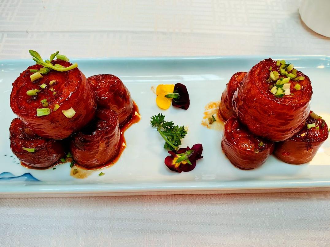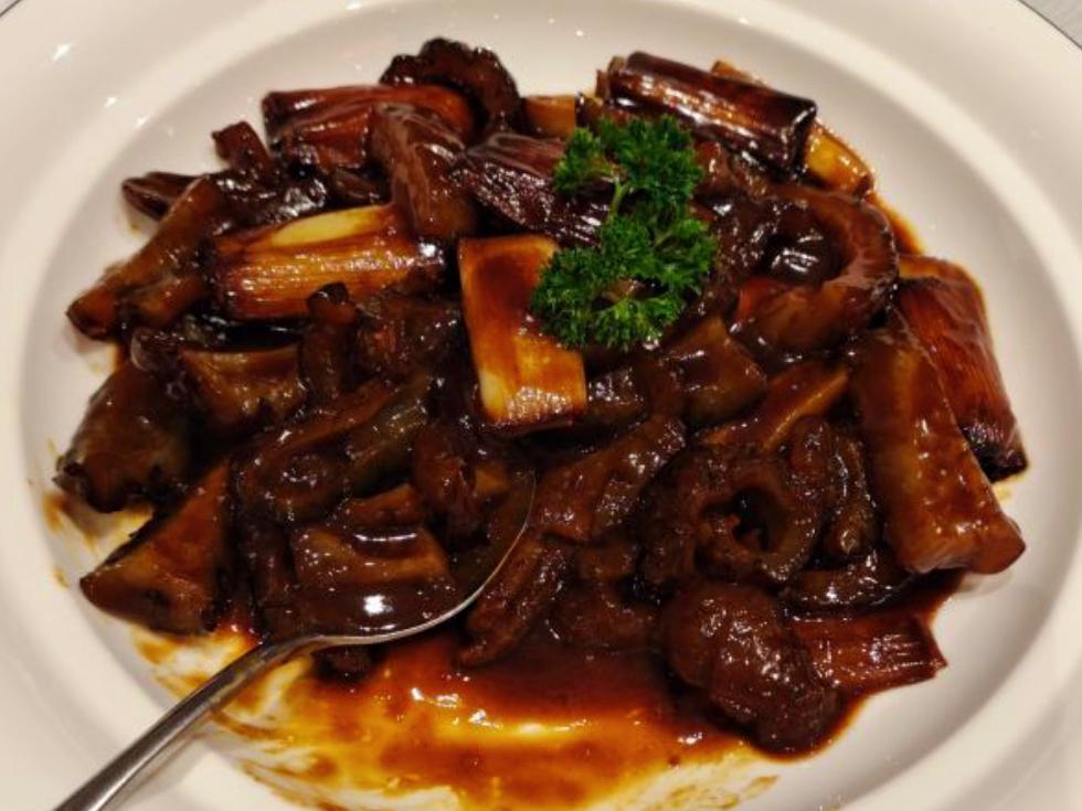 葱烧海参是鲁菜的经典名菜,用的是南海黄玉参,经过涨发、煨汤、炸葱、炒制等多个步骤制作而成,葱香浓郁,咸鲜回甘。