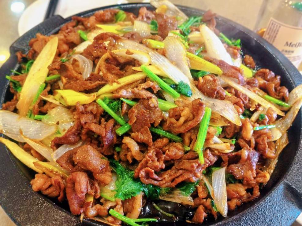 烤肉宛的炙子烤肉选用牛上脑、尚头里脊为主材,切成薄片,放入料汁腌制入味,然后放到铁条做成的炙子上,加入葱丝,烤制而成,香味浓郁,软嫩多汁。