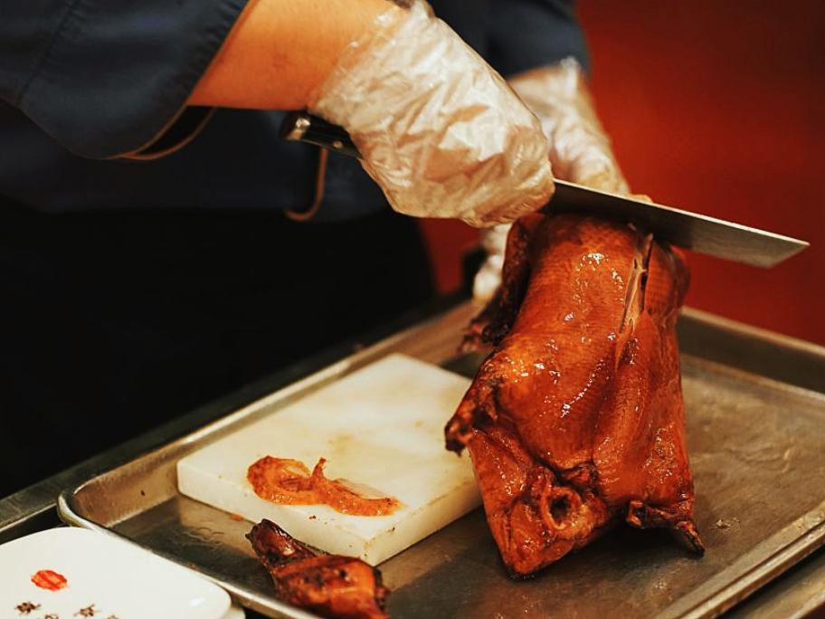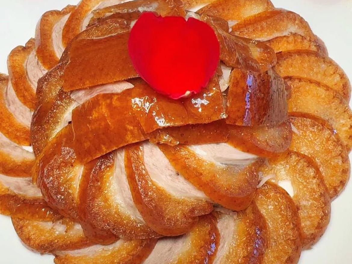 全聚德的烤鸭也是使用北京填鸭,采用挂炉技艺,用果木烤制而成,烤出的鸭子色泽枣红,熏香浓郁,外皮酥脆,肉质鲜嫩,再配上甜面酱、黄瓜丝、葱丝,吃起来肥而不腻。