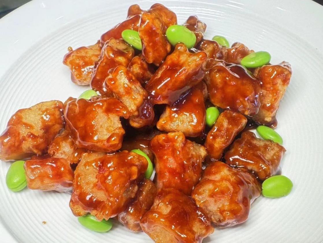 酱爆肉丁也非常不错,猪里脊肉经过腌制、上浆、滑油,再配上甜面酱炒制而成,酱味十足,外酥里嫩,唇齿留香。
