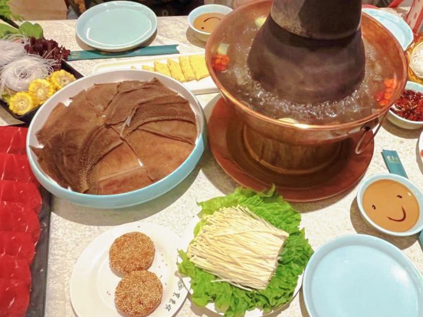 颇具历史气息的紫铜火锅,来上一锅清水,只需放一些红枣、葱段、枸杞,水开后,放入手切鲜羊肉,煮至变色,蘸上香浓的芝麻酱,软嫩入味,满满的都是肉香。