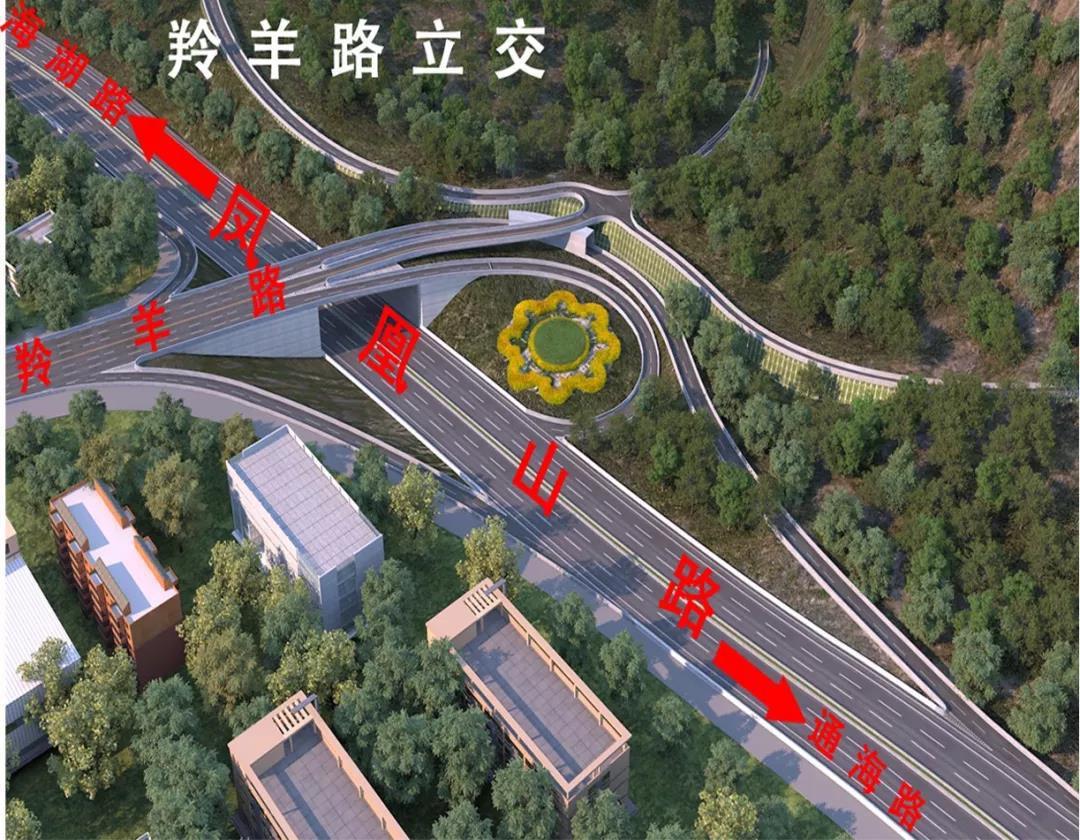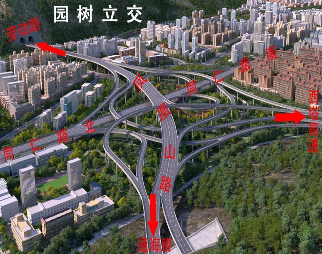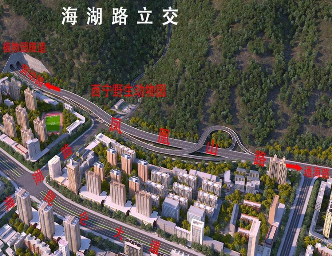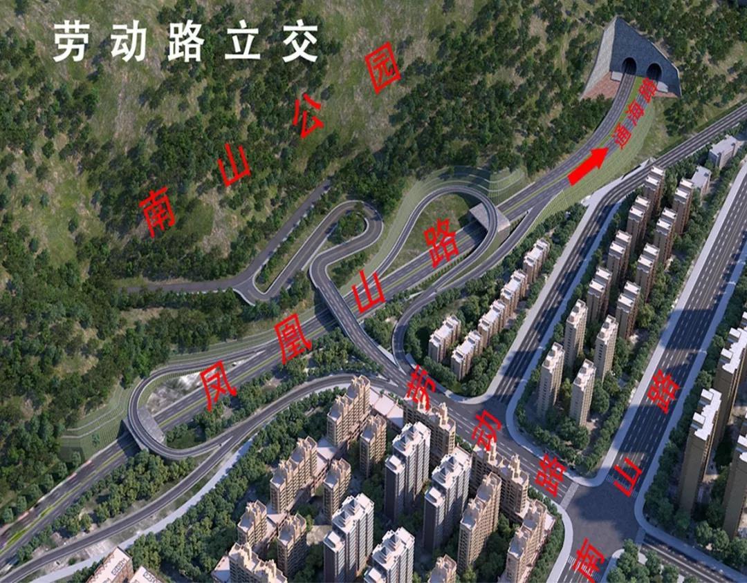 目前,已建成试通车的凤凰山快速路(西段)通海路至劳动路段从东向西依次途径劳动路、园树立交、海湖路、羚羊路、通海路5个下线口,并经过南山隧道和植物园隧道2个隧道。