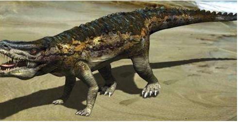 有角鳄(Desmatosuchus)出现于中、晚三叠纪的北美洲,灭绝于三叠纪末期。身长5米左右,头部及