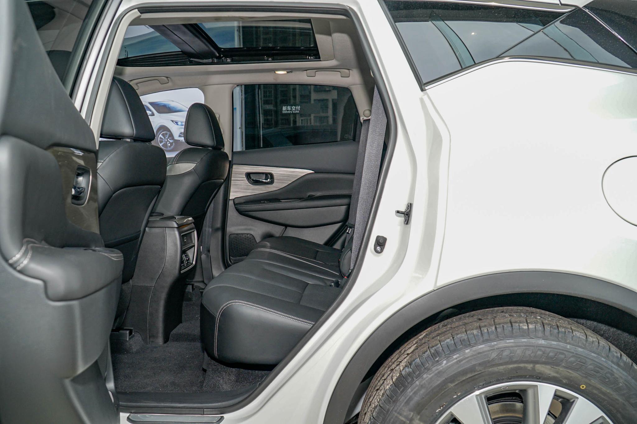 座椅方面采用真皮材质,依旧延续了日产大沙发设计,坐起来非常舒适。我们把前排座椅调整到适合我的坐姿(笔者身高173cm,体重53kg),前排头部空间1拳零3指。我们保持前排座椅位置不变一起去后排感受一下后排空间表现怎么样吧?后排腿部空间2拳零3指,头部空间4指,整个空间表现还是不错的。