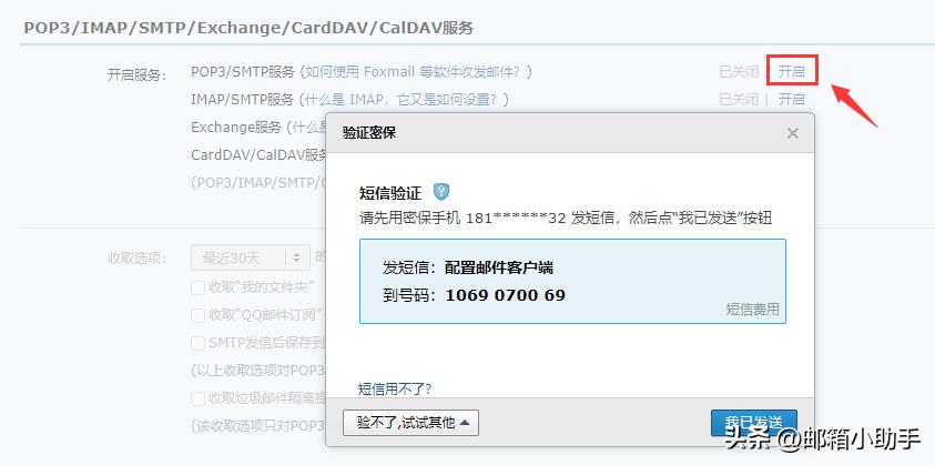 第二步:开启服务以“POP3/SMTP服务”为例,点击【开启】按钮,需要短信验证(根据提示发送短信),点击【我已发送】即可(如下图所示);