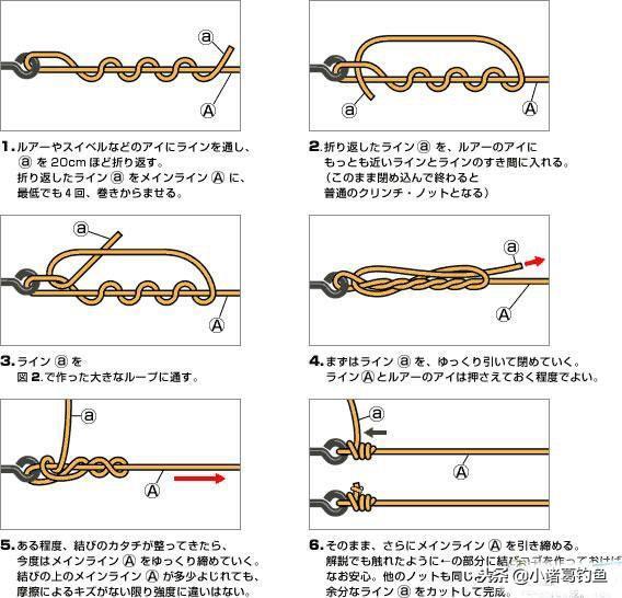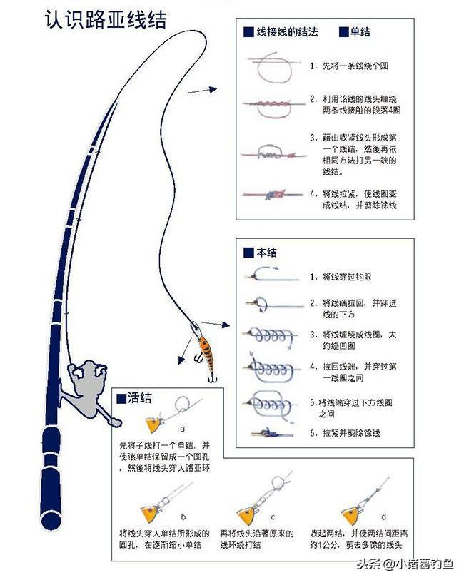 一副完整的路亚钓组包括路亚竿、路亚轮、主线、前导线、拟饵等几部分组成。下面就分别图解每个部分的绑法。