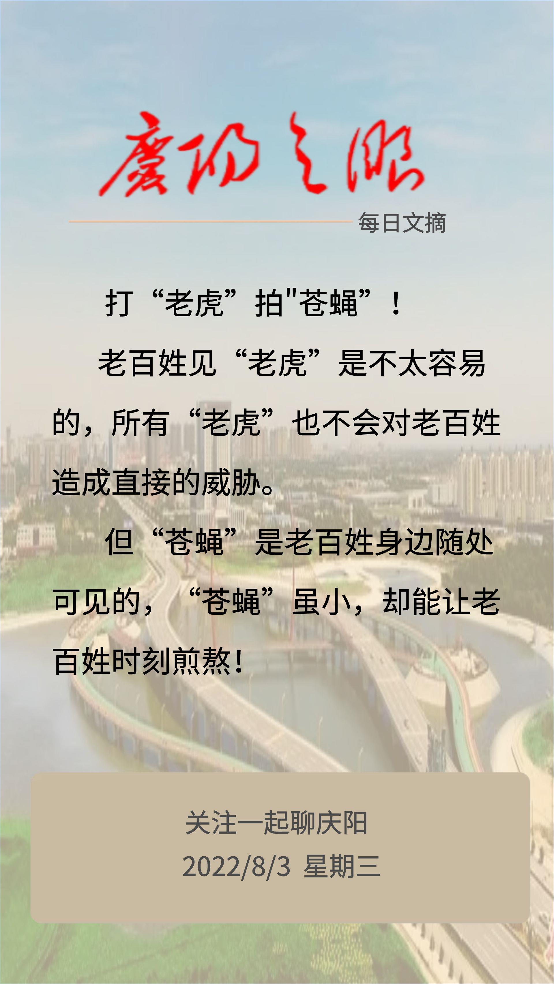 每日文摘:打“老虎”拍"苍蝇”! 老百姓见“老虎”是不太容易的,所有“老虎”也不会对老百姓造成直接的威胁。但“苍蝇”是老百姓身边随处可见的,“苍蝇”虽小,却能让老百姓时刻煎熬!