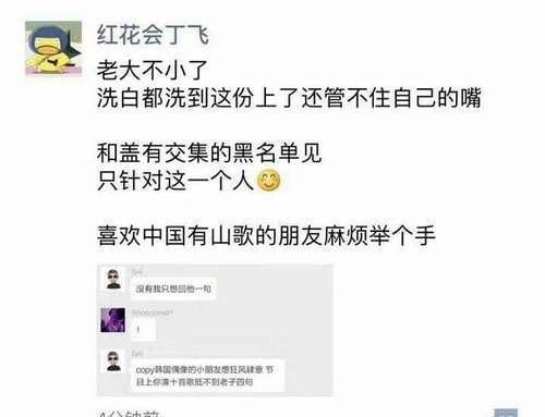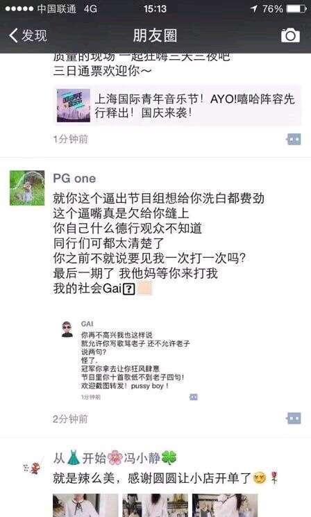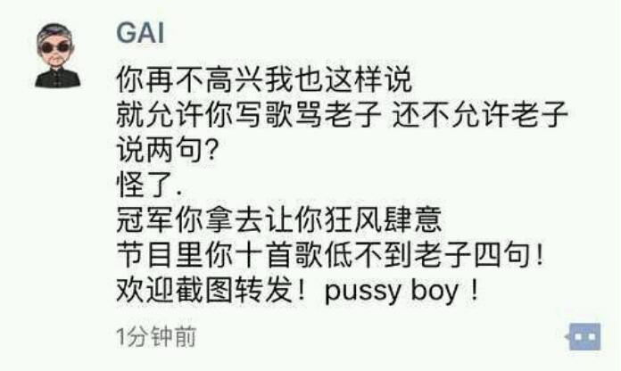 中国有嘻哈刚产生全国六强,不过GAI和PG one 无疑是最热门的夺冠选手。决赛还没来临,两位竞争对手就已经在朋友圈开撕了。PG one直接在朋友圈怼Gai,Gai则留言称PG one为“pussy boy”。同一厂牌的红花会丁飞也在朋友圈喷Gai。