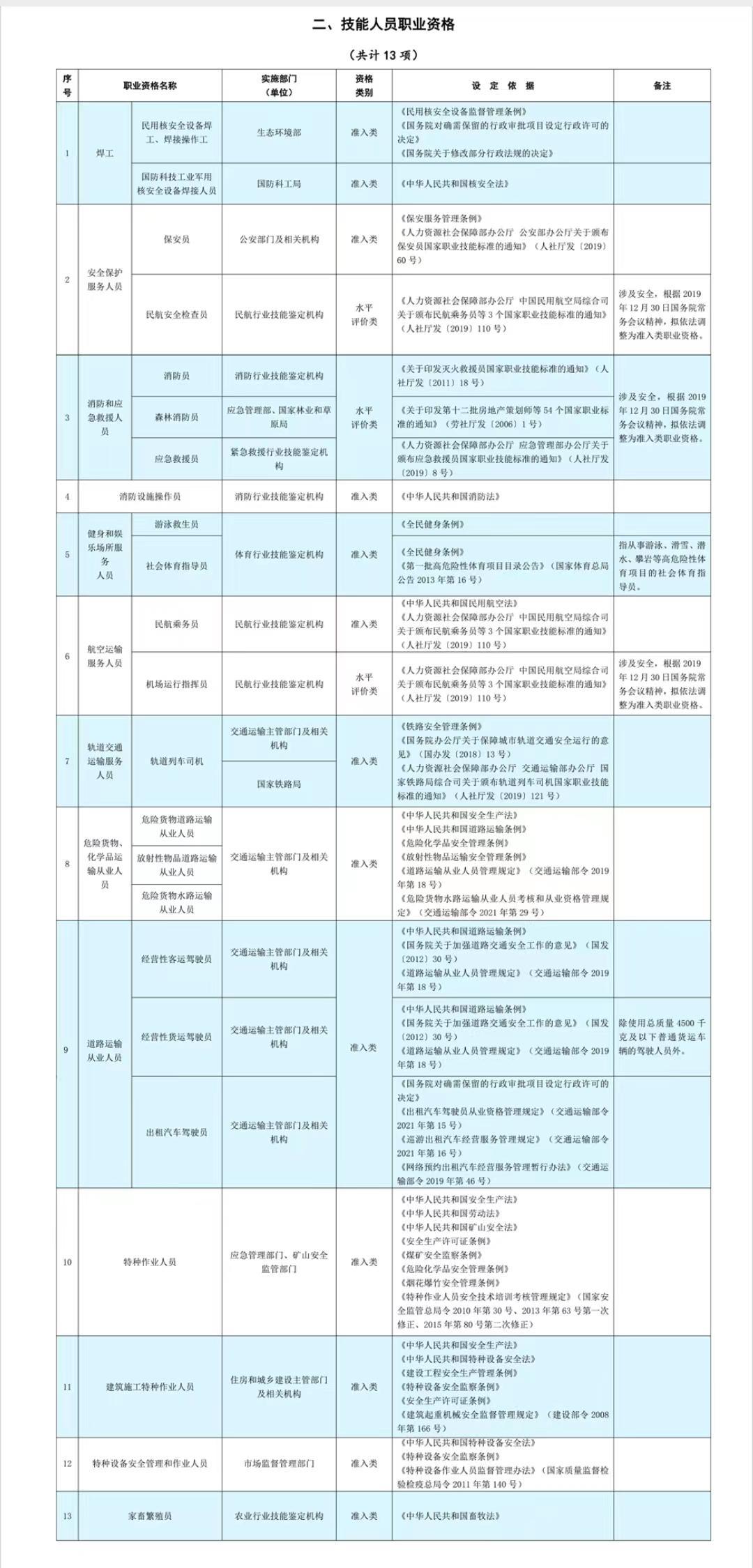 技能人员职业资格证书13项