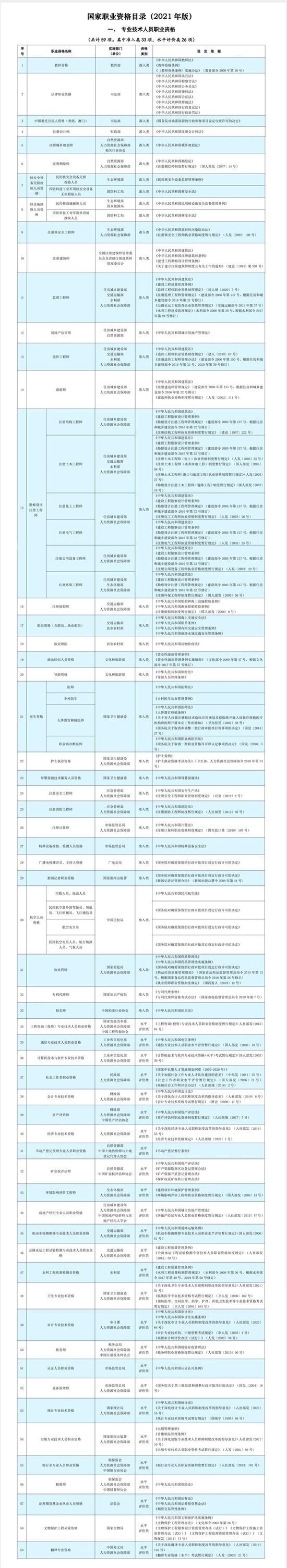 专业技术人员职业资格证书59项(其中准入类33项,水平评价类26项)