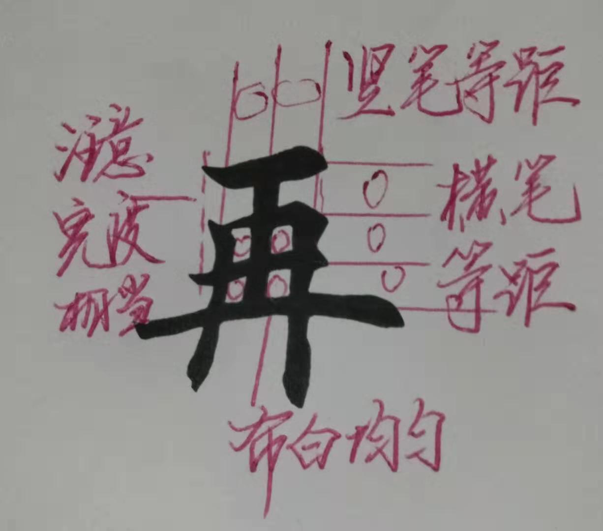 字贵在结构,重在笔法。再结构要点是竖笔等距和横笔等距。首横几乎与中横相等,底横几乎等于上横的两倍,要求布白均匀,上紧下松,诸横扛肩角度不宜太大。(再)