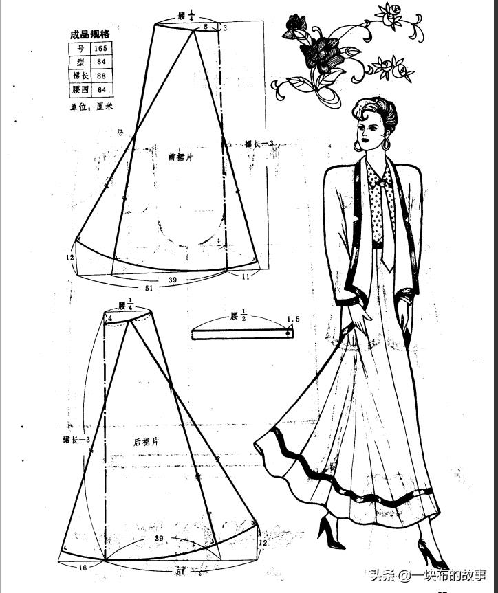 在A字裙的基础上又加了大摆,很飘逸,三角形两边的长度,和裙子侧面长度是一样的,打板的时候注意, 不然拼合在一起会不一样长。