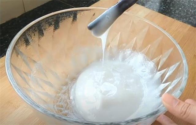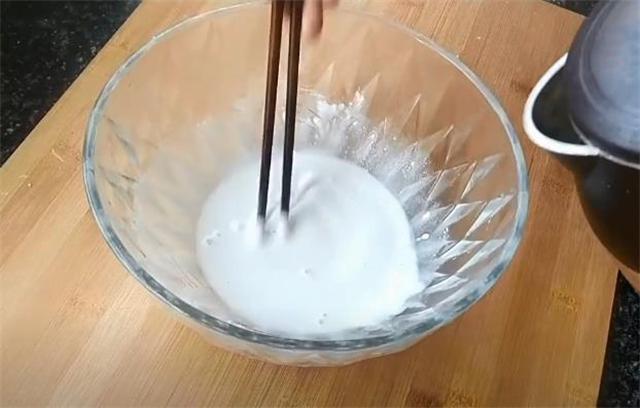 2.然后再一次性倒入刚烧开的水打芡,要不停地搅拌,一直搅拌到成半透明状,像这样能往外拉丝就可以了。