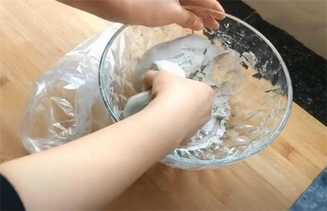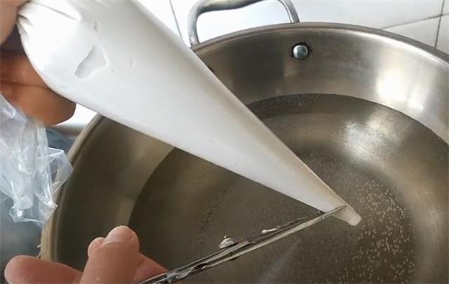 4.把面团装到裱花袋里,喜欢粗的就剪个大洞,喜欢细的就剪个小洞。