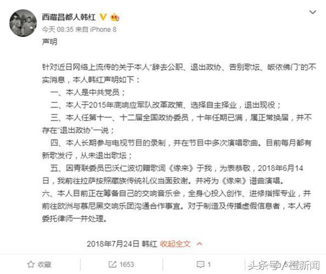 韩红的声明。图:互联网