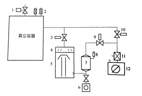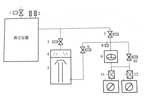 1——真空室充气阀; 2——真空测量规; 3——高真空阀; 4——冷阱; 5——油扩散泵; 6——维持泵; 7——储气罐; 8——真空规(测扩散泵前级压力); 9——前级阀; 10——预抽阀; 11——电磁压差阀; 12——机械泵