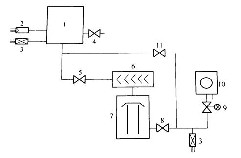 1——真空室; 2——电离真空规; 3——热偶真空规; 4——放气阀; 5——高真空阀; 6——冷阱; 7——扩散泵; 8——前级真空阀; 9——电磁压差阀; 10——机械泵; 11——预(粗)抽阀