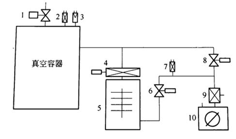 1——真空室放气阀; 2——真空测量规; 3——高真空阀; 4——冷阱; 5——油扩散泵; 6——前级阀; 7——粗(预)抽阀; 8——真空膜盒继电器; 9——罗茨泵; 10——旁通阀;