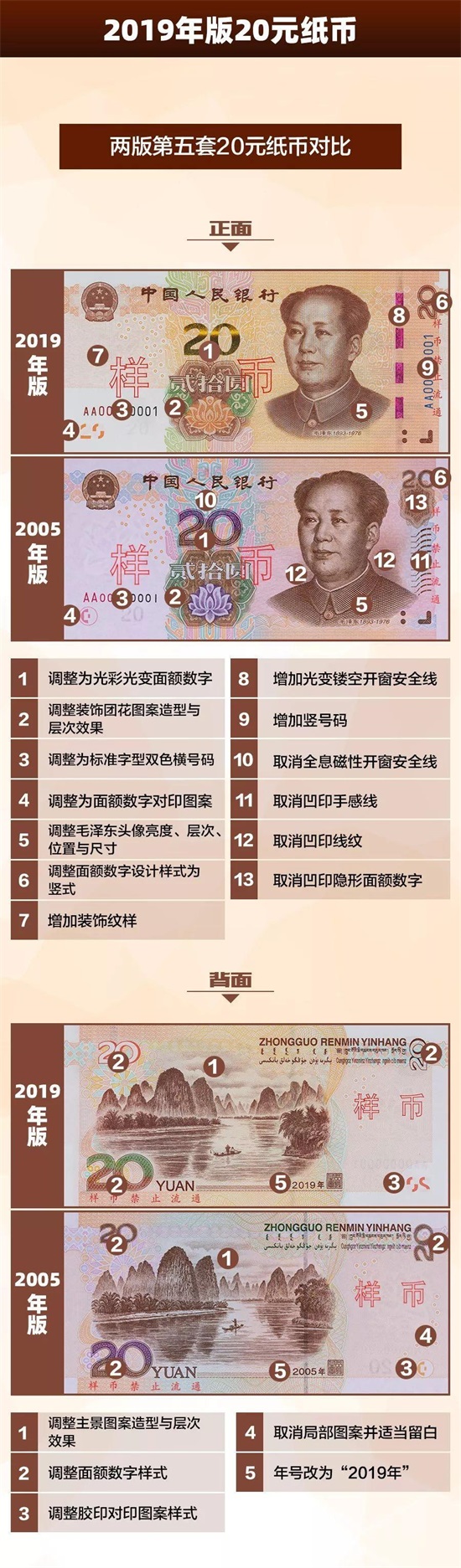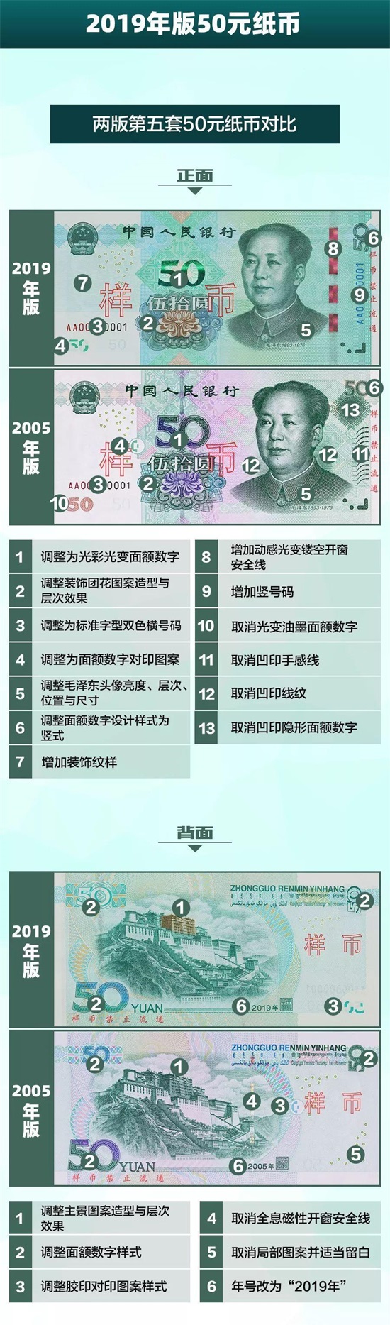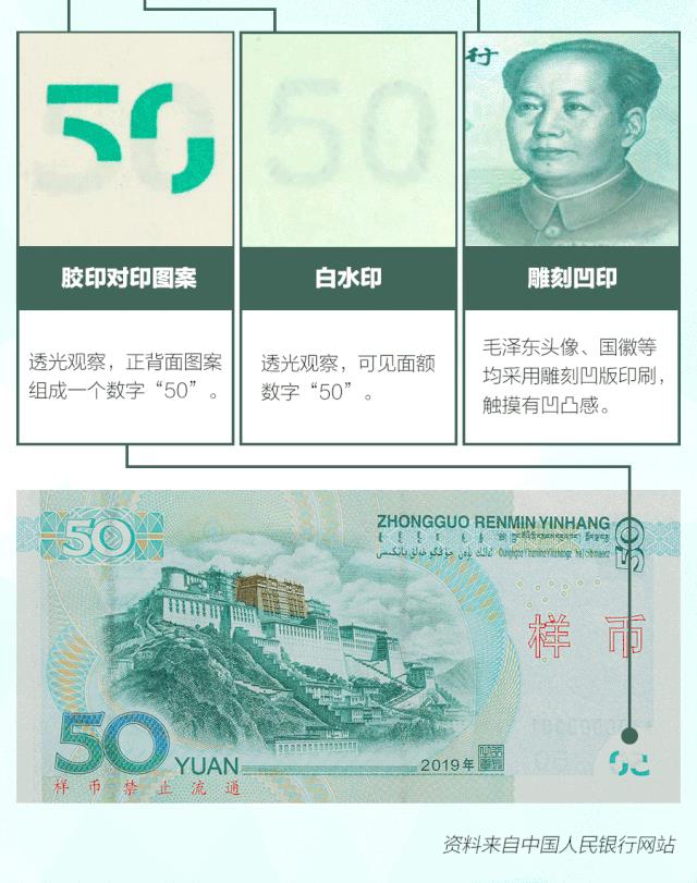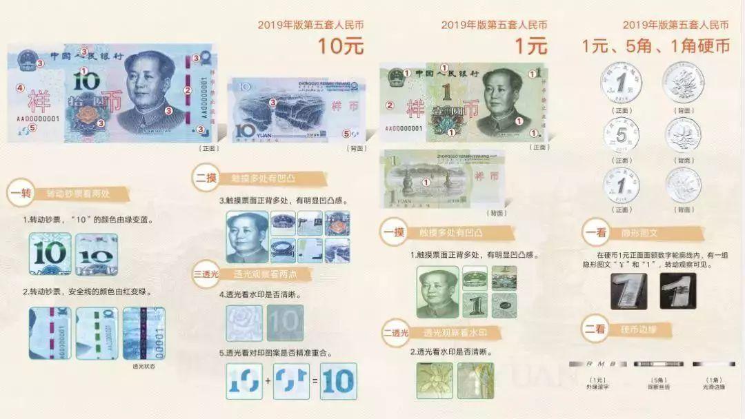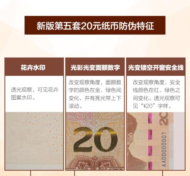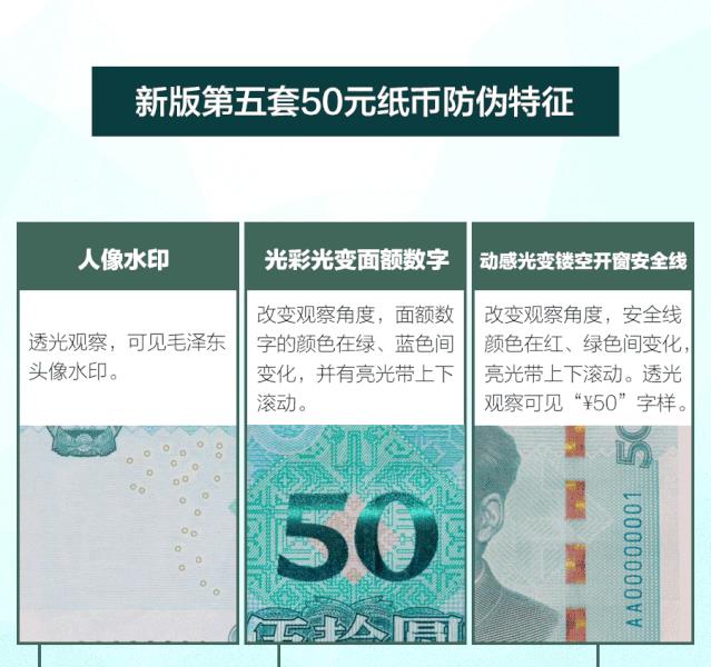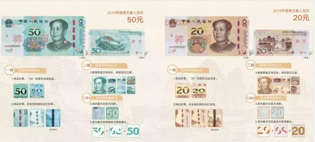 新版50元、20元、10元、1元纸币较旧版而言,票面更加鲜亮精美,印刷更加优质耐用,防伪性能更加突出。