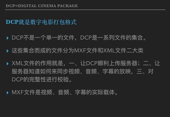 好这是先简单了解一下关于DCP是个什么的概念。接下来是详细地讲解这些MXF和XML到底起到了什么样的作用。