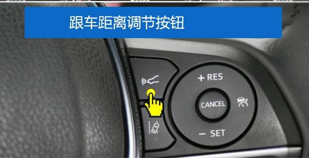 跟车距离这个按键共有3级可调,您可根据道路情况自行调节距离,另一个按键为车道保持功能,此键激活后,当车辆偏离车道时,方向盘会修正方向,并有仪表提示如下