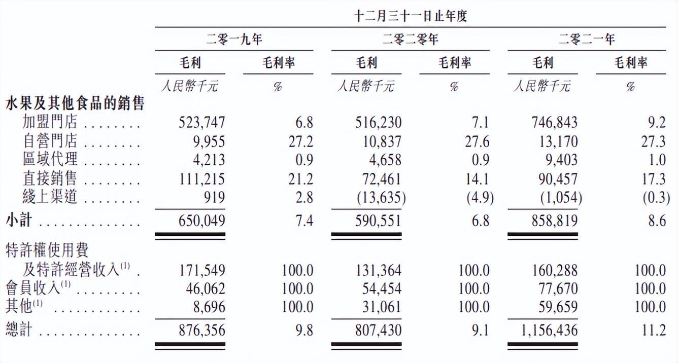 报告期内百果园的主要收入渠道来于加盟,但同时加盟店毛利率较低,2019年-2021年,百果园的加盟门店销售毛利率分别为6.8%、7.1%和9.2%,同期自营门店毛利率稳定在27%左右。