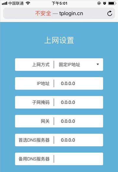 (3)如果检测到上网方式:固定IP地址 (静态IP)——> 则需要在页面中,填写运营商提供的:IP地址、子网掩码、默认网关、首选DNS服务器、备用DNS服务器。