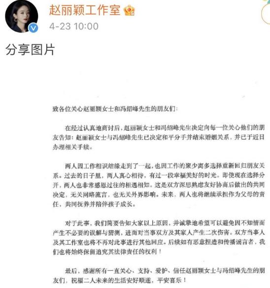 4月23日早上冯绍峰赵丽颖官宣离婚,娱乐圈里明星感情问题瞬息万变。
