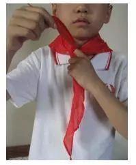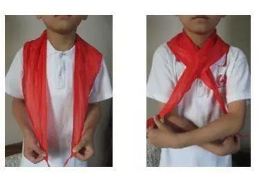 第一步:将红领巾披在肩上,钝角对准脊椎骨,右角放在左角下面,两角交叉;