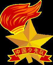 五角星加火炬和写有“中国少先队”的红色绶带组成少先队队徽。五角星、“中国少先队”五个字和火炬柄为金色,绶带和火炬的火焰为正红色,火焰和绶带镶金边,“中国少先队”字体为黑体。