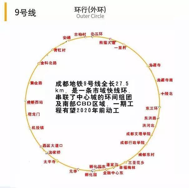 成都地铁9号线:是继7号线后的另一条规划环型线,其中一期工程长27.5km,采用地下线的敷设方式,设地下车站14座,预计将于2016年底开工。线路走向方面,成都地铁9号线一期工程起于两河森林公园,止于金融中心东站,将东南面的琉璃片区、南部金融城片区、西南面的双楠片区和西面的西站片区串联起来。具体站点规划为两河森林公园站-成都西客站-武青北路站-机投镇站-西区大道口站-百锦路站-沈家桥站-太平寺站-孵化园站-金融城站-金融中心东站共11个站点 ...