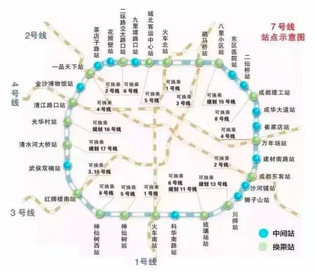 成都地铁7号线:线路全长38.61km,全为地下线,共设地下车站31座,换乘站18座。线路将串起成都站、成都东站、成都南站三大铁路枢纽,围二环路至三环路绕市区一圈,与2.5环,即中环路走向大致相同,将成为成都第一条地铁环型线。成都地铁7号线工程已于2013年5月底动工建设,计划于2017年年底建成试运营!运营长度为38.61公里!