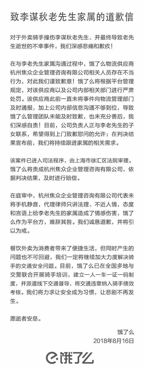 8月16日晚,“饿了么网上订餐”官方微博发布“道歉信”。