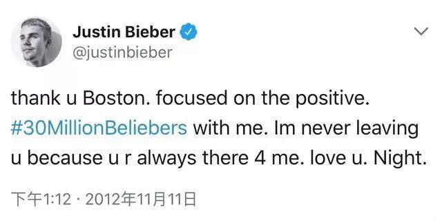 那段时间比伯心情很差,在网上经常写心情,去感谢粉丝们:谢谢你们,我永远不会离开你们,因为你们一直在支持和陪伴着我。