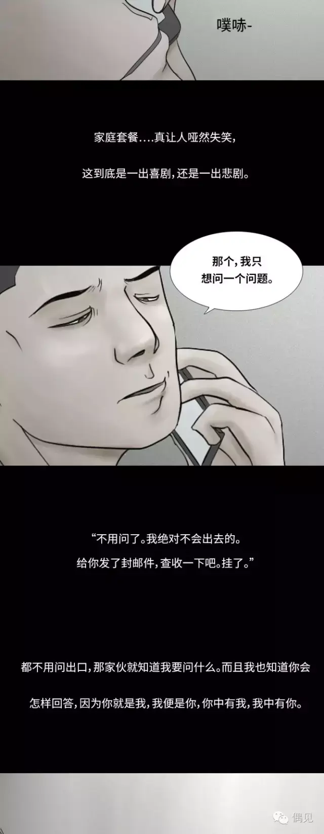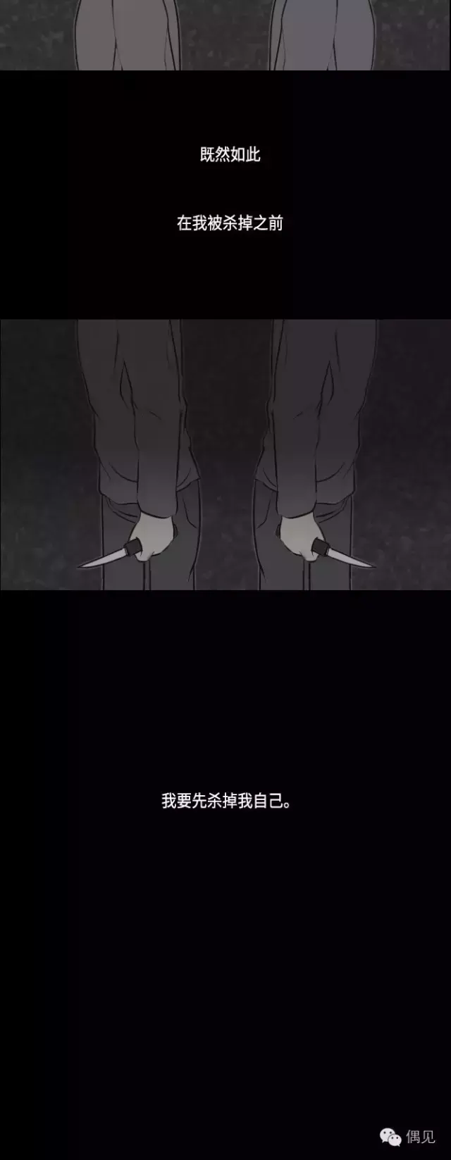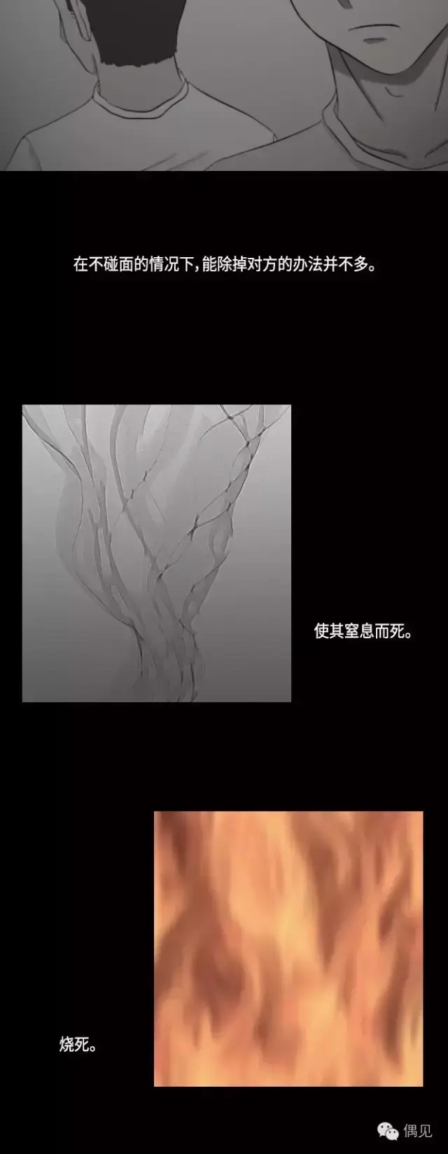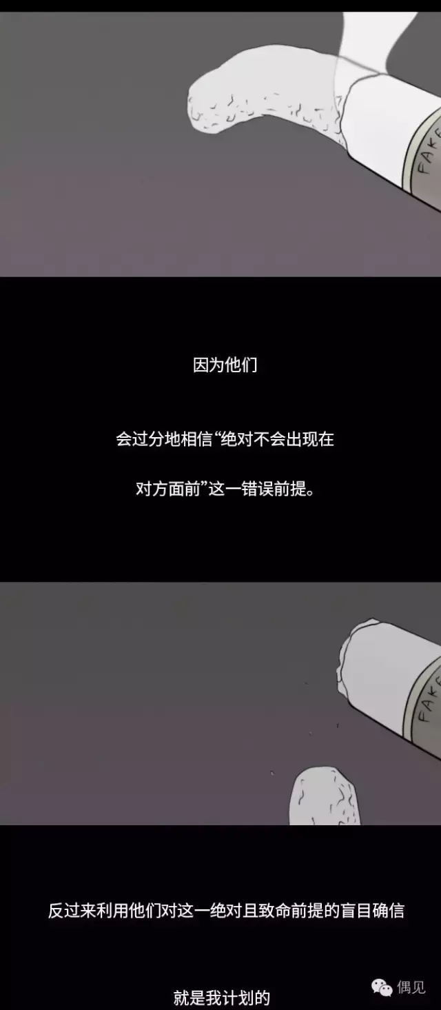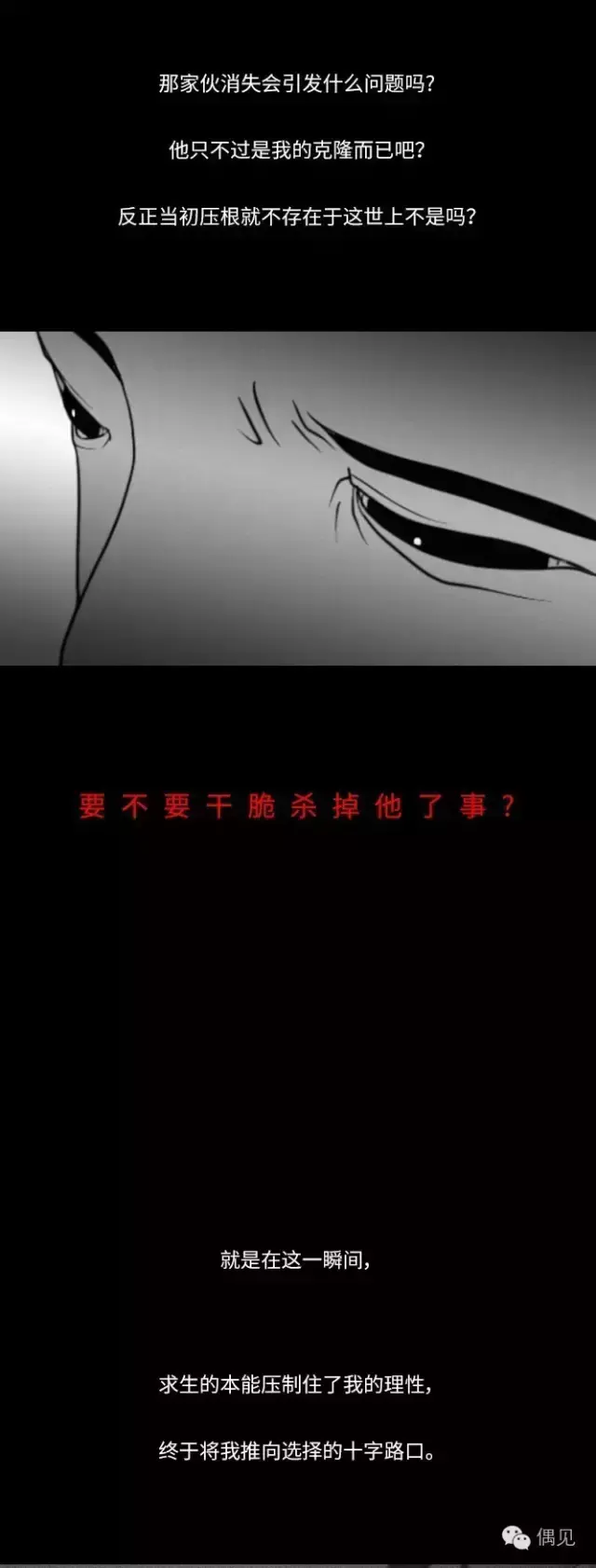 马丰荣——个人认为,从上一话可以看出,本体拿的是pepper spray这个是防狼喷雾,并不是毒气。然后从这一话的图片可以看出来,开了门之后两个人的手指都没有按在喷雾的按钮上而是看见了之后就倒下了。如果说分身本体见面的话分身必死,那么主体有可能没死,倒在地上没动是因为他从日常的思维或者共享的思考中察觉到了第三个人的存在,想用这种引蛇出洞的方式用本话里面装逼的分身的话说“给他们两个都除掉”而且通过之前的文章多次重复,他的思想就是另外两个的思想,所以他可以察觉出第三者的存在。但是主体和分身见面之后都会死的话,那为什么第二个分身还敢在他们都倒下的时候去准备处理尸体呢。。。所以就假设是主体和分身见面后主体没事,分身会死,而这最后就是反转的反转,分身毕竟是分身,还是没有主体的鸡贼。