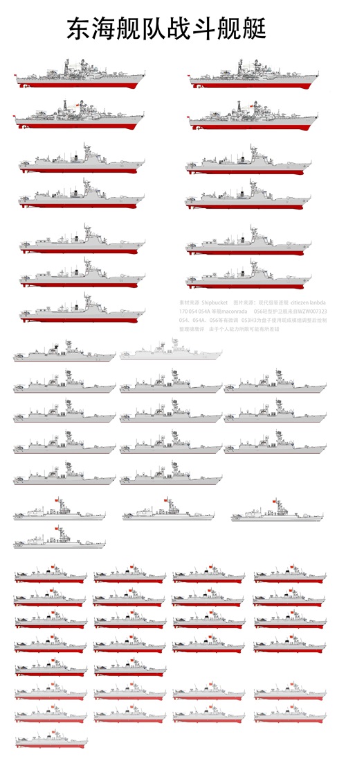 东海舰队共拥有1艘两栖攻击舰(即将服役)、15艘驱逐舰、15艘导弹驱逐舰,其中包括052D/DL型导弹驱逐舰7艘,分别为131“太原”舰、132“苏州”舰、133“包头”舰、134“绍兴”舰、154“厦门”舰、155“南京”舰和156“淄博”舰。150“长春”舰、151“郑州”舰、152“济南”舰、153“西安”舰、26艘护卫舰(另有11艘056型轻护即将划转海警部队,所以不计算在内)。