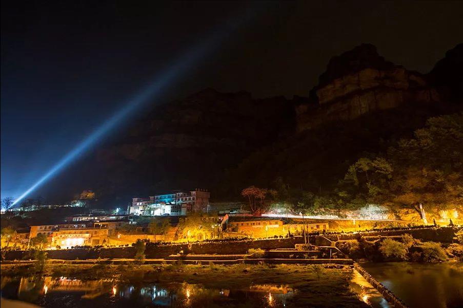 夜幕降临、华灯初上,夜景尤为迷人。小镇上虹霓光影、灯火璀璨,水面倒映着两岸建筑,亭台楼阁,青砖灰瓦,更显得古香古色。夜风习习、游人如织,犹如迷离梦境,被誉为太行山深处的“不夜城”。