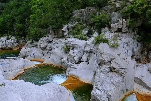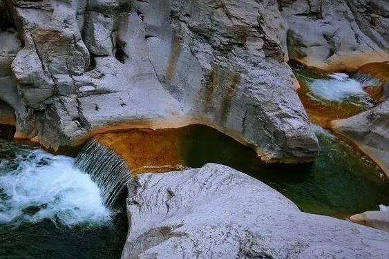 莲花谷斗折蛇行、蜿蜒曲折,谷内溪流清澈,流水淙淙,犹如一条绿色的玉带穿谷而过;飞瀑深潭,奇峰怪石,随处可见。溯溪而行,冰臼千姿百态,石壁突兀嶙峋,蔚为壮观。