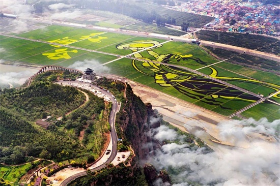 金秋时节,稻谷飘香,登临此处还可以观赏到风景绝美的巨型稻田画。稻田画是用紫、黄、白、绿四色水稻种植而成, 占地上千亩,利用彩绘种植方式,每年打造出不同的栩栩如生、精美绝伦的艺术画象。广阔的彩色稻田配以村庄、山谷、河流,呈现出一幅风景绝美的七彩画卷。