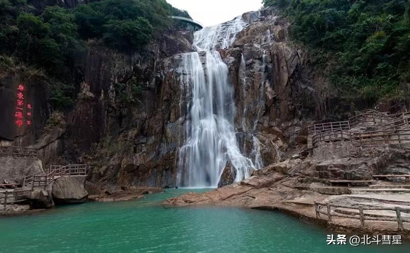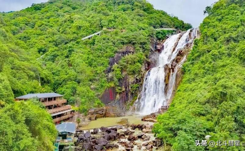 龙归寨瀑布,地处释迦山脉,景色壮丽,气势磅礴,似彩练、如崩雪,高125米,落差115米,宽度62米,被誉为广东省的黄果树瀑布,享有“粤东第一瀑”之美誉。