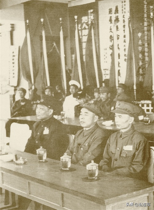 1945年新四军第四师与淮北军区召开军事建设会议时主席团合影。左三为赖毅,左六邓子恢,左十张爱萍。