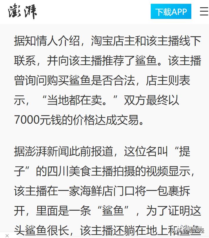 该文章还引述知情人的话,淘宝店主和女网红“提子”是线下联系,并向“提子”推荐了鲨鱼。“提子”曾询问购买鲨鱼是否合法,店主则表示,“当地都在卖。”